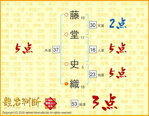 藤(19画)堂(11画) 史(5画)織(18画)