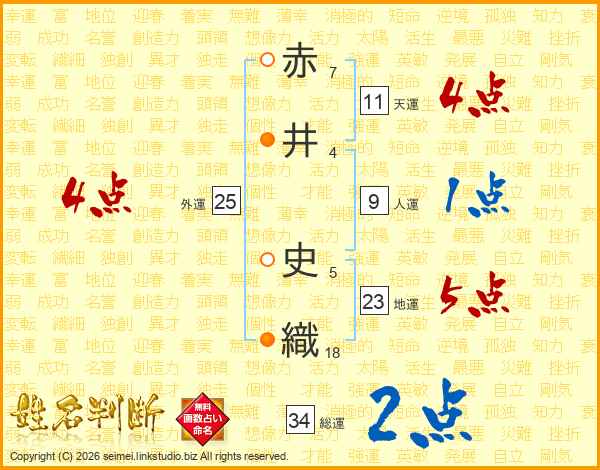 あなたの人生を表す1番重要な運勢です。生涯を通じて影響する総合運となり、主に50歳以降の晩年期に影響を及ぼします。苗字と名前の合計画数。