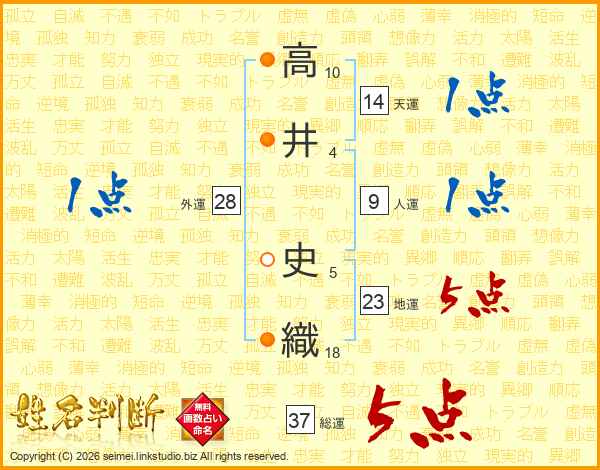高(10画)井(4画) 史(5画)織(18画)