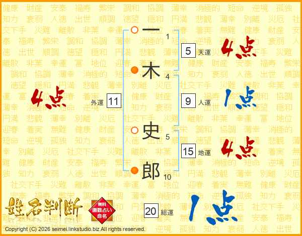 あなたの人生を表す1番重要な運勢です。生涯を通じて影響する総合運となり、主に50歳以降の晩年期に影響を及ぼします。苗字と名前の合計画数。