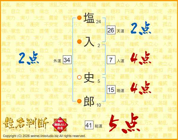 あなたの人生を表す1番重要な運勢です。生涯を通じて影響する総合運となり、主に50歳以降の晩年期に影響を及ぼします。苗字と名前の合計画数。