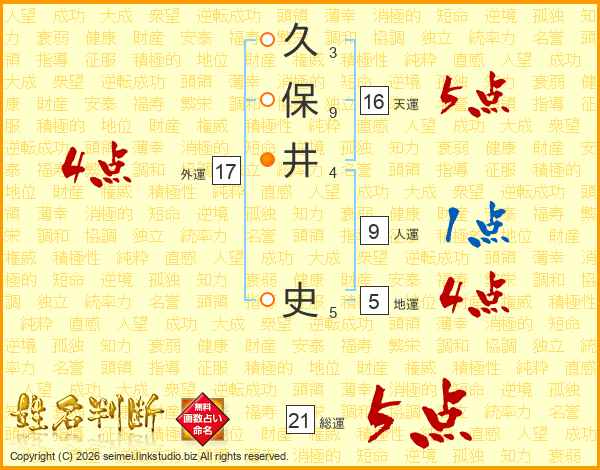 生活面を象徴する運勢です。外部から受ける影響力を表し、結婚運、家庭運や職場、環境への順応性を表します。総運から人運を引いた画数。姓や名が1文字の場合を除く。