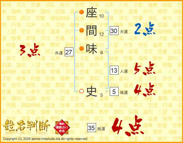 家系が持つ宿命的な運勢を表します。祖先から受け継いだ苗字ですので自分の力が及びません。家柄を象徴します。苗字の合計画数。