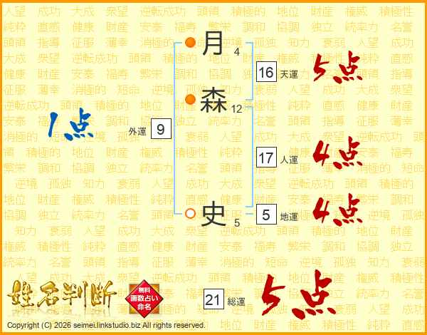 あなたの人生を表す1番重要な運勢です。生涯を通じて影響する総合運となり、主に50歳以降の晩年期に影響を及ぼします。苗字と名前の合計画数。
