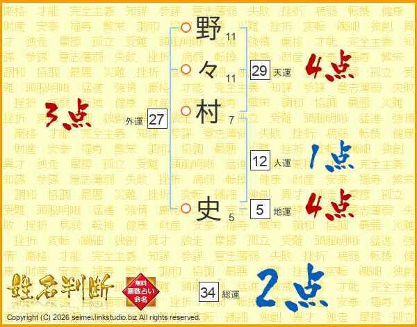 あなたの人生を表す1番重要な運勢です。生涯を通じて影響する総合運となり、主に50歳以降の晩年期に影響を及ぼします。苗字と名前の合計画数。