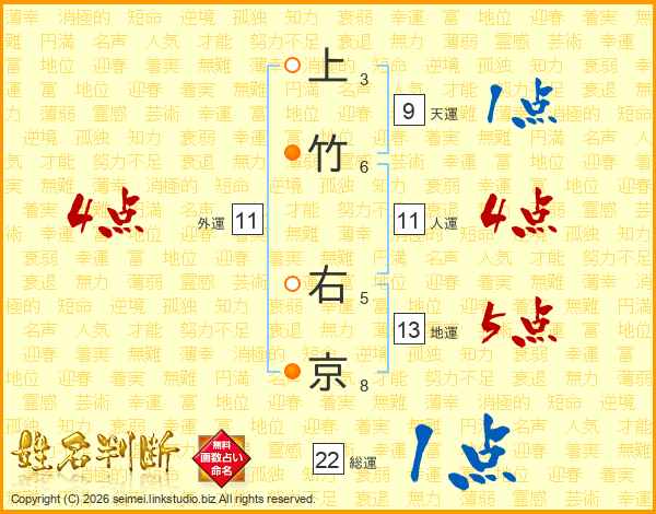 生活面を象徴する運勢です。外部から受ける影響力を表し、結婚運、家庭運や職場、環境への順応性を表します。総運から人運を引いた画数。姓や名が1文字の場合を除く。