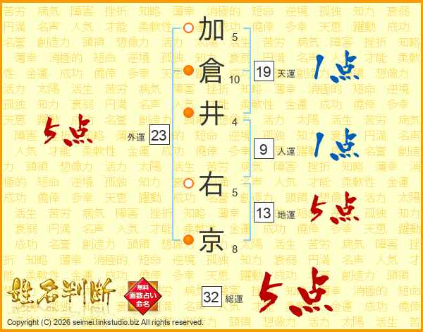 加倉井右京さんの総運は32画の5点!