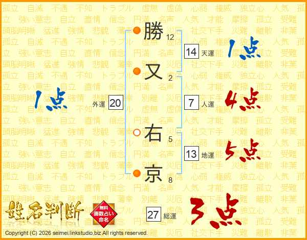 生活面を象徴する運勢です。外部から受ける影響力を表し、結婚運、家庭運や職場、環境への順応性を表します。総運から人運を引いた画数。姓や名が1文字の場合を除く。