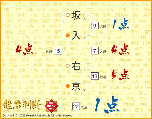 坂入右京さんの総運は22画の1点!