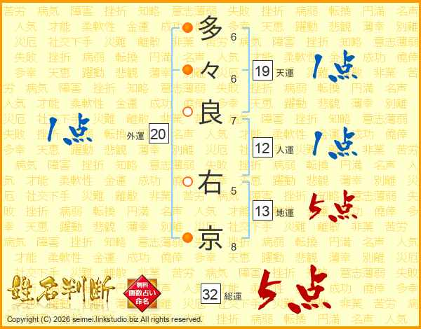 多々良右京さんの総運は32画の5点!