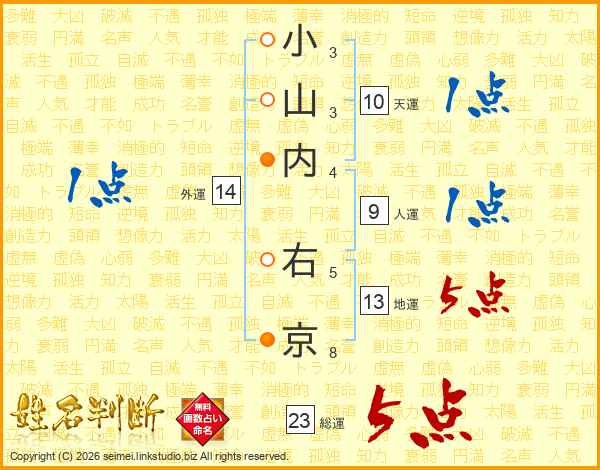 小山内右京さんの総運は23画の5点!