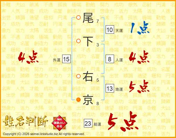 生活面を象徴する運勢です。外部から受ける影響力を表し、結婚運、家庭運や職場、環境への順応性を表します。総運から人運を引いた画数。姓や名が1文字の場合を除く。