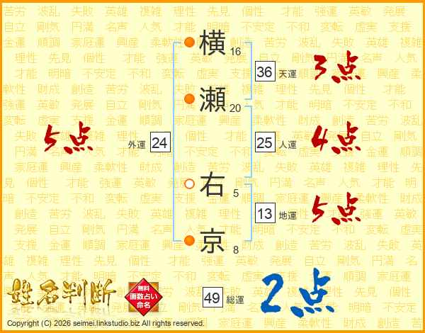 横瀬右京さんの総運は49画の2点!