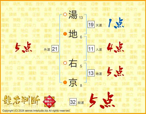 生活面を象徴する運勢です。外部から受ける影響力を表し、結婚運、家庭運や職場、環境への順応性を表します。総運から人運を引いた画数。姓や名が1文字の場合を除く。