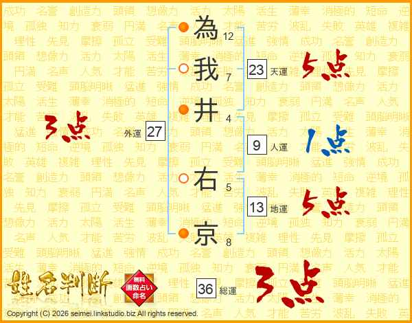 為我井右京さんの天運は23画の5点!