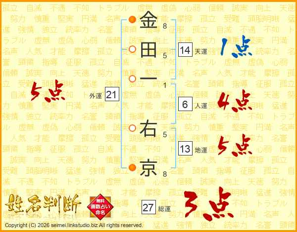 金(8画)田(5画)一(1画) 右(5画)京(8画)