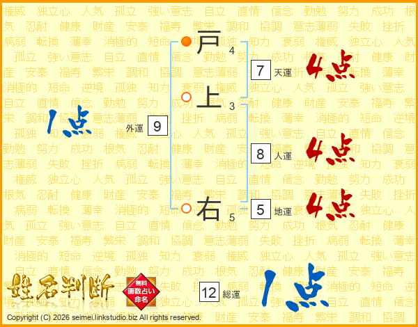 生活面を象徴する運勢です。外部から受ける影響力を表し、結婚運、家庭運や職場、環境への順応性を表します。総運から人運を引いた画数。姓や名が1文字の場合を除く。