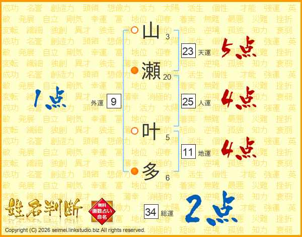 山瀬叶多さんの天運は23画の5点!