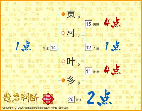 東(8画)村(7画) 叶(5画)多(6画)