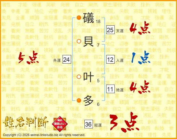 礒貝叶多さんの天運は25画の4点!
