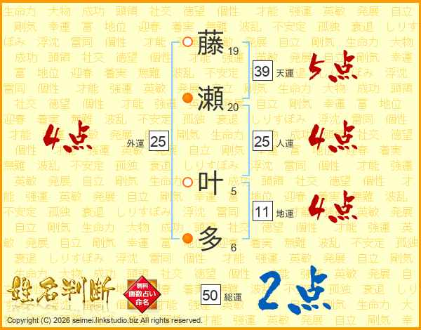 藤(19画)瀬(20画) 叶(5画)多(6画)
