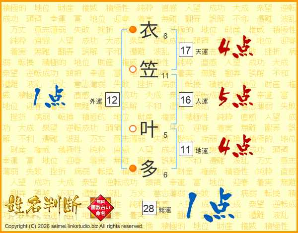 生活面を象徴する運勢です。外部から受ける影響力を表し、結婚運、家庭運や職場、環境への順応性を表します。総運から人運を引いた画数。姓や名が1文字の場合を除く。