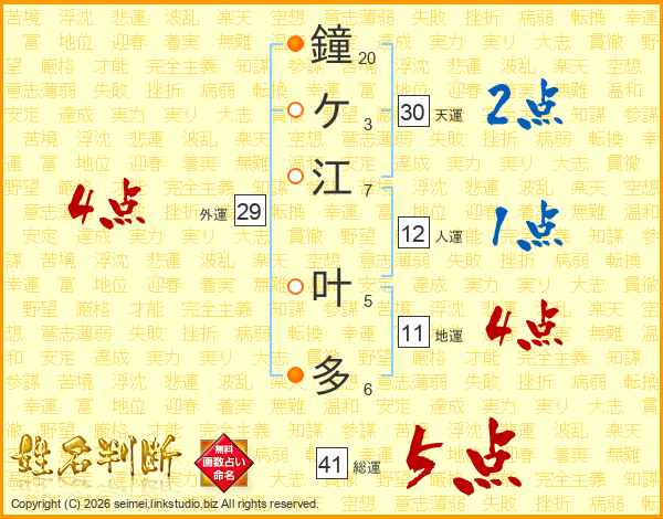 鐘ケ江叶多さんの天運は30画の2点!