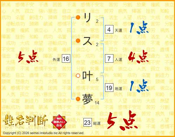 リ(2画)ス(2画) 叶(5画)夢(14画)