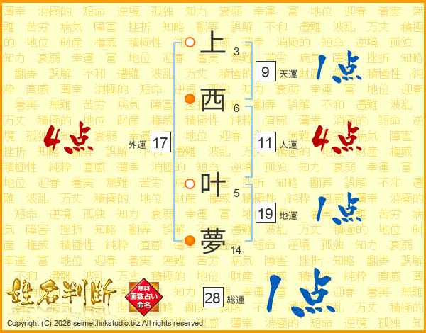 生活面を象徴する運勢です。外部から受ける影響力を表し、結婚運、家庭運や職場、環境への順応性を表します。総運から人運を引いた画数。姓や名が1文字の場合を除く。