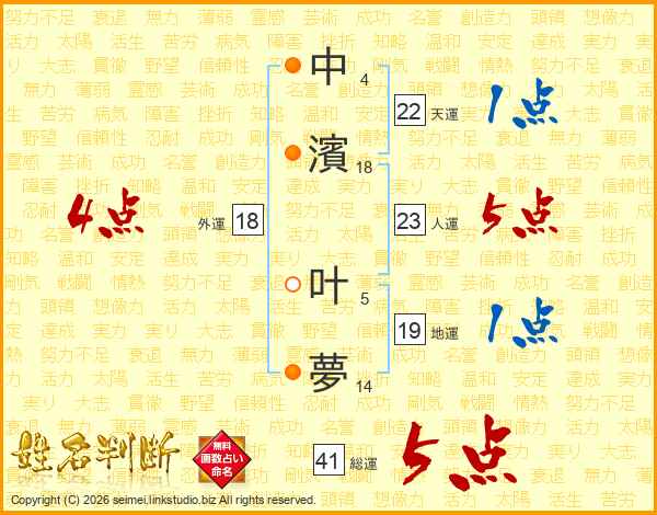 中(4画)濱(18画) 叶(5画)夢(14画)