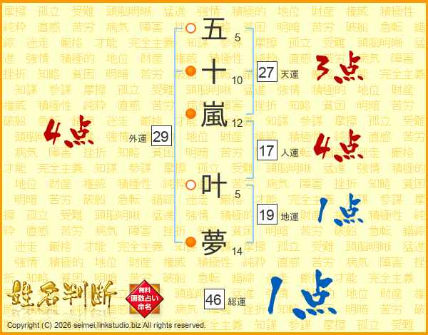 五(5画)十(10画)嵐(12画) 叶(5画)夢(14画)