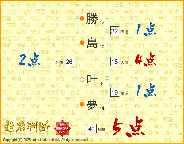 勝(12画)島(10画) 叶(5画)夢(14画)