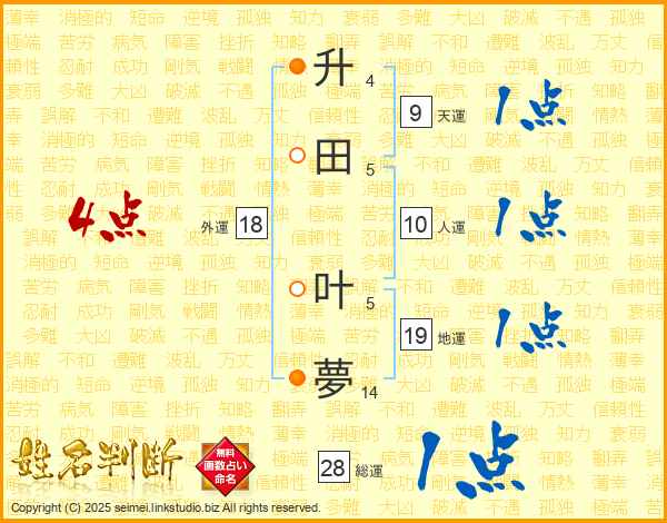 生活面を象徴する運勢です。外部から受ける影響力を表し、結婚運、家庭運や職場、環境への順応性を表します。総運から人運を引いた画数。姓や名が1文字の場合を除く。