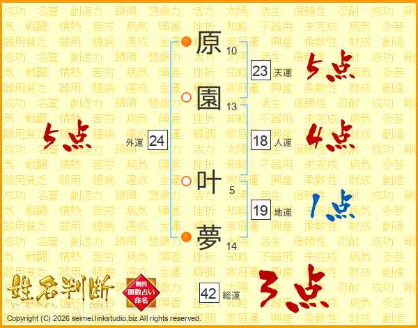 原(10画)園(13画) 叶(5画)夢(14画)