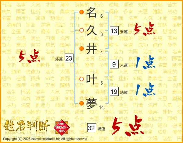 名(6画)久(3画)井(4画) 叶(5画)夢(14画)