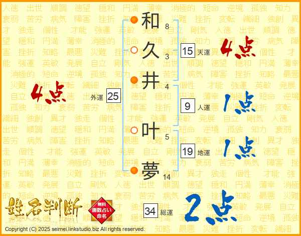 和(8画)久(3画)井(4画) 叶(5画)夢(14画)