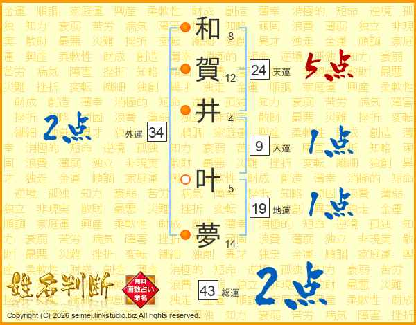 和(8画)賀(12画)井(4画) 叶(5画)夢(14画)