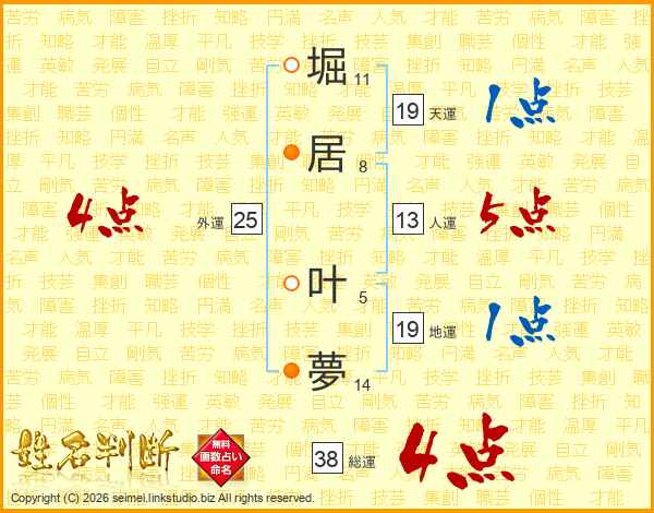 堀(11画)居(8画) 叶(5画)夢(14画)