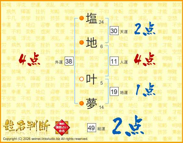 塩(24画)地(6画) 叶(5画)夢(14画)