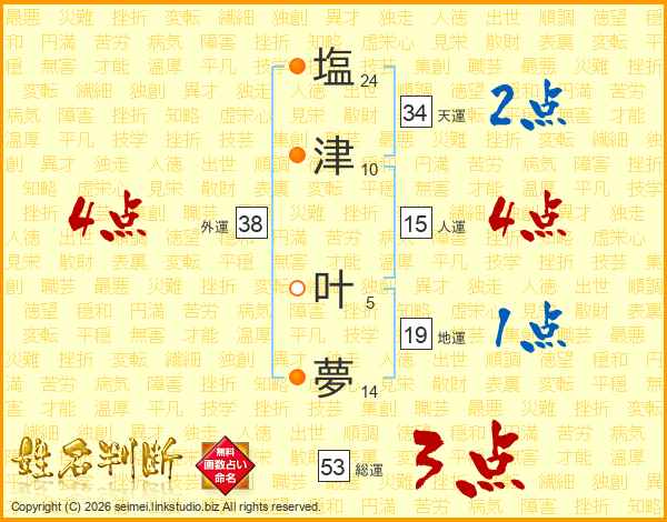 塩(24画)津(10画) 叶(5画)夢(14画)