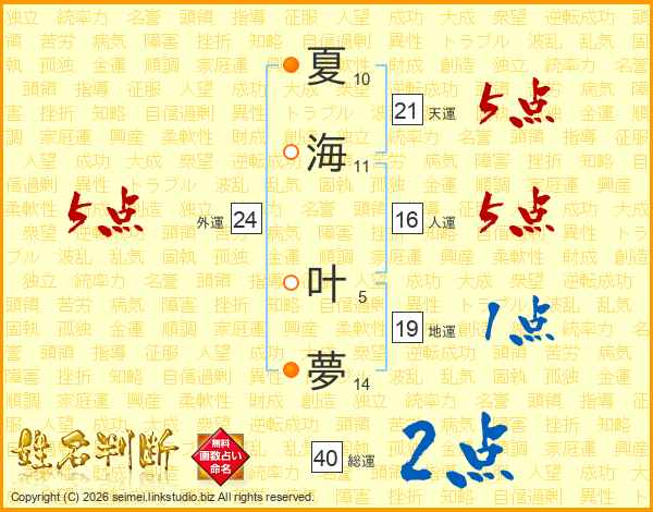 夏(10画)海(11画) 叶(5画)夢(14画)