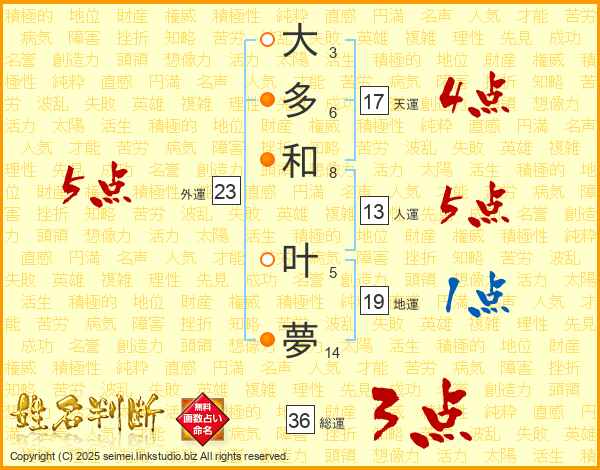 大(3画)多(6画)和(8画) 叶(5画)夢(14画)