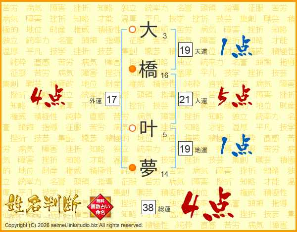 大(3画)橋(16画) 叶(5画)夢(14画)