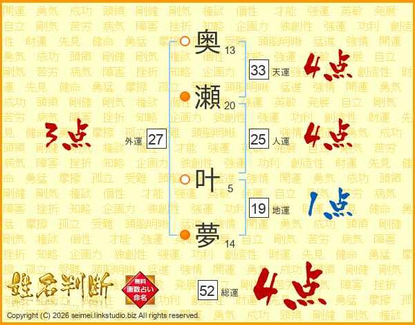奥瀬叶夢さんの総運は52画の4点!