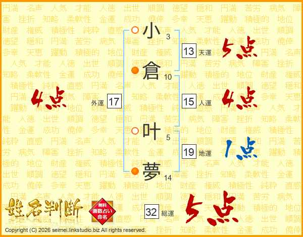 小(3画)倉(10画) 叶(5画)夢(14画)
