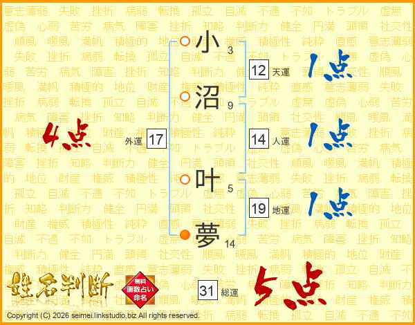 小(3画)沼(9画) 叶(5画)夢(14画)