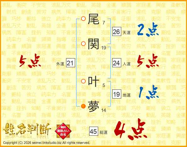 尾(7画)関(19画) 叶(5画)夢(14画)