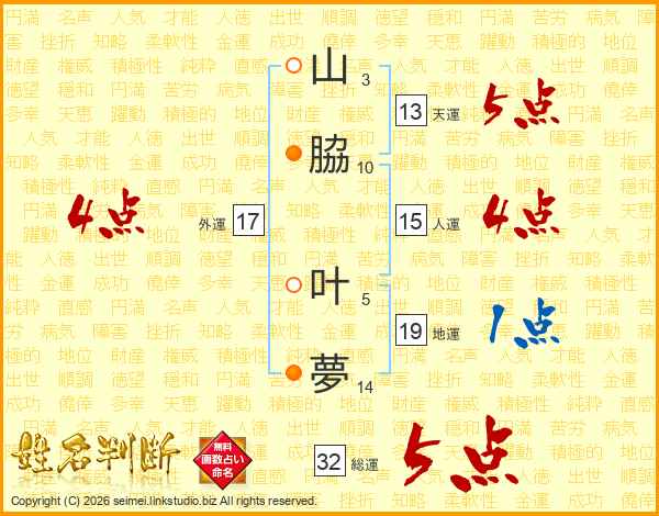 山(3画)脇(10画) 叶(5画)夢(14画)