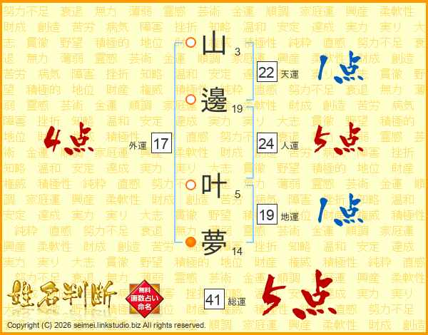 山邊叶夢さんの総運は41画の5点!