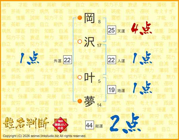 岡(8画)沢(17画) 叶(5画)夢(14画)